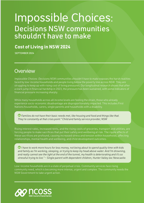 NCOSS has released its annual Cost of Living in NSW report, Impossible Choices: Decisions NSW communities shouldn’t have to make investigating the impact of rising cost of living on people living in poverty and in low-income households across NSW. This year, the research shone an additional spotlight on the impact of these pressures on households with children.