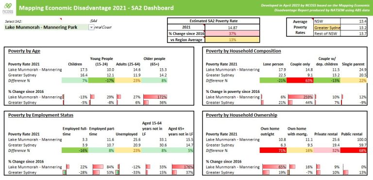 Data Dashboard (updated August 2023). It allows users to drill-down to individual small geographic areas to see poverty rates for different variables, how they compare to NSW averages, and how they have changed since 2016.